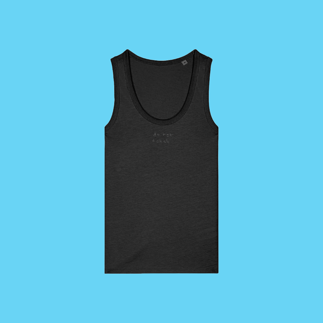 Classic fitted vest tank top perfect for a bratty summer :) Thin material. Keep cool in the heat n get those nips out! Embroidered with one of Tilly's original handwritten cheeky text designs - 'do not touch'. Ummmm. Needs no further explaining?