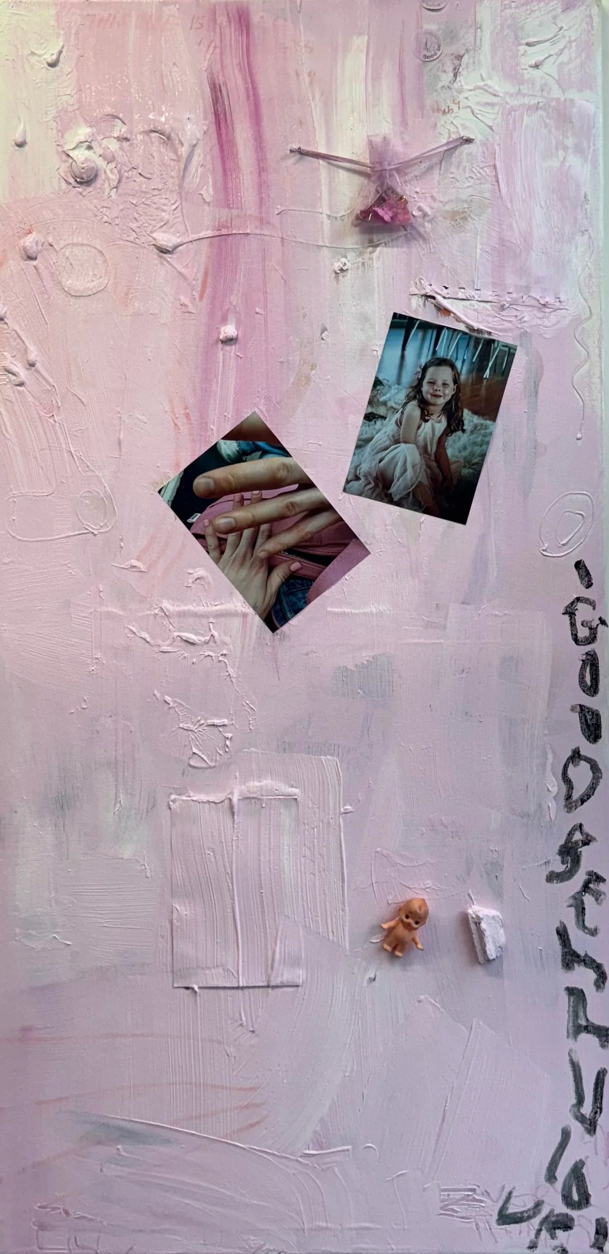 GOOD BEHAVIOUR. 2025. 100cm x 50cm x 2cm. Acrylic, tempera paint stick, hot glue, collage/photographic materials, glitter glue, plastic Qewpie doll, rough black tourmaline crystal, mesh bag, assorted metal and plastic objects, nails, plastic button, felt tip pen and pencil on canvas.