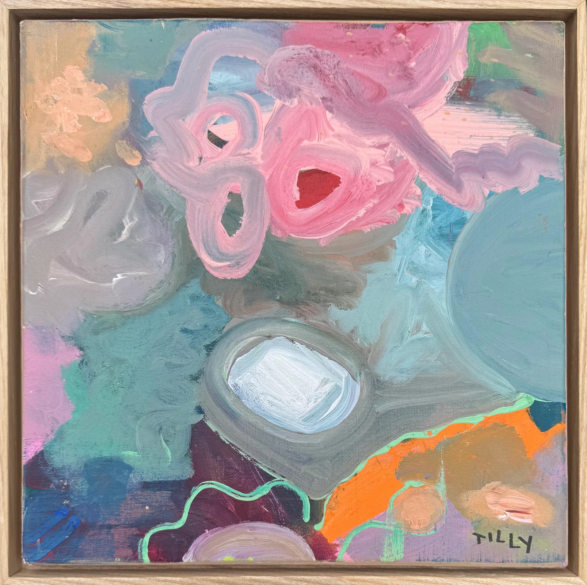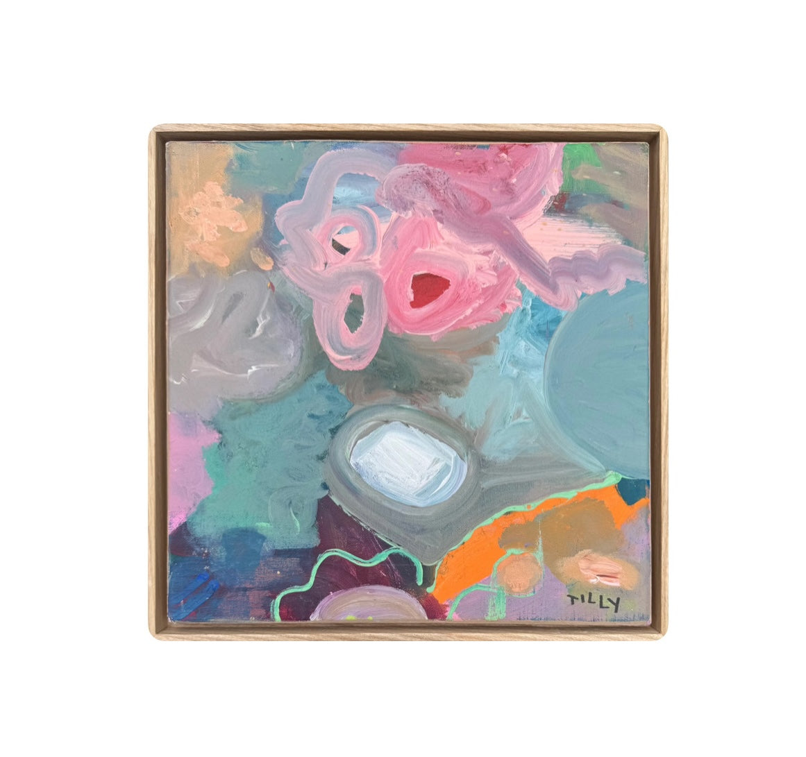 Good Vibrations. 2024. Acrylic paint on canvas. Professionally framed in varnished ash floater frame. 30cm x 30cm before frame.